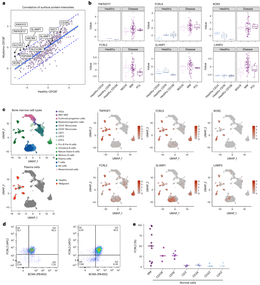 (a) MM 和健康骨髓样本中表面蛋白的中值标准化原始强度的相关性。(b) 健康造血细胞和恶性浆细胞中选定的表面蛋白的蛋白质水平。(c)UMAP可视化。(d) MM 样本中BCMA(TNFRSF17)(x轴)和 FCRL2(y轴)表达的 FACS 分析。(e) MM 细胞中 FCRL2 阳性细胞的百分比,以及其他正常血液细胞群中表达极少或无表达的百分比。