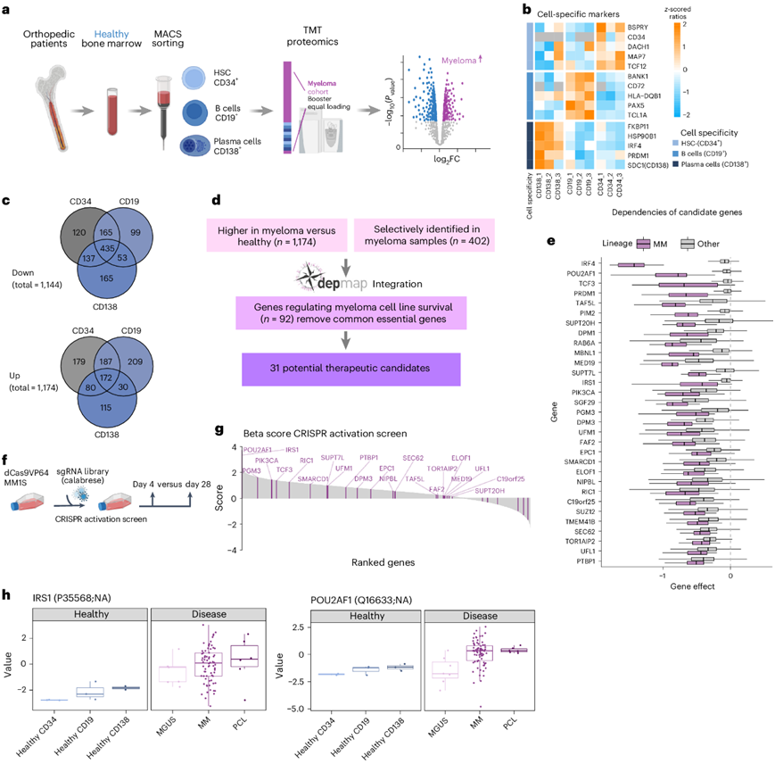(a)实验流程。(b) 健康样本中细胞谱系特异性标志物的蛋白质水平。(c) 维恩图显示与健康样本相比,MM 样本中上调和下调蛋白质的重叠。(d) 数据分析工作流程,以从骨髓瘤上调或特异性表达的蛋白质中识别潜在的治疗候选物。(e) 显示了骨髓瘤和其他细胞系中潜在治疗靶点的基因效应。(f) CRISPR–Cas9 激活筛选的工作流程。(g) 按 beta 值排序的基因对增殖的影响。(h) 健康和恶性细胞群中 IRS1 和 POU2AF1 的蛋白质水平。