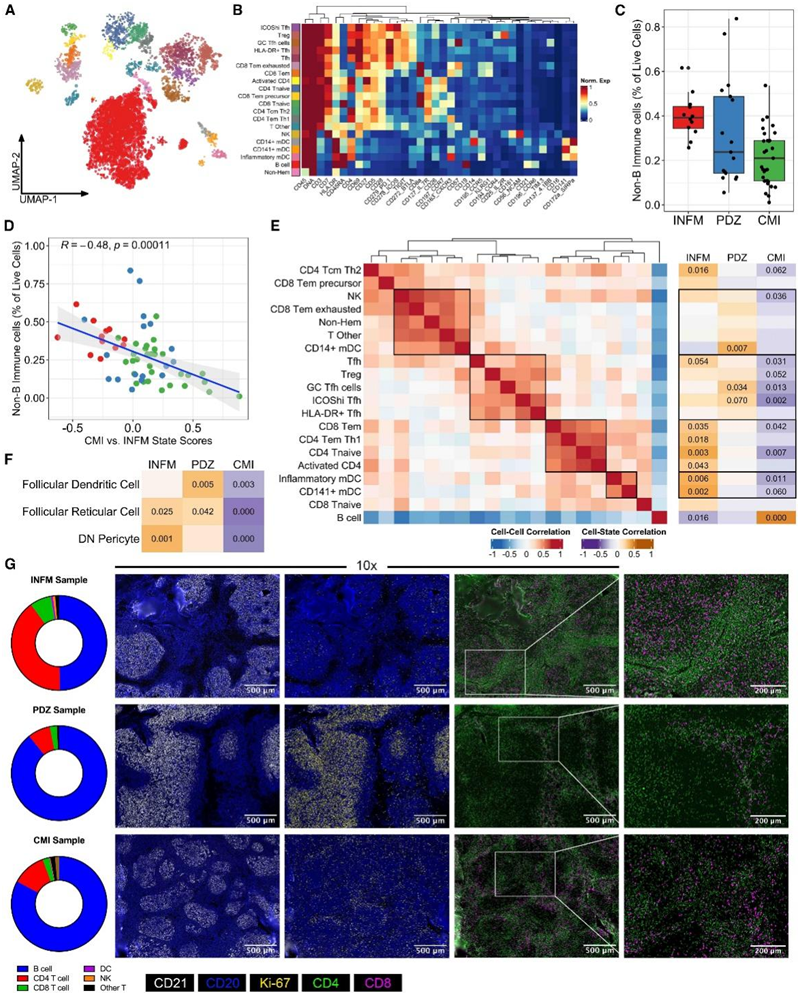 为了确定INFM、PDZ和CMI与其免疫细胞含量之间的显著关系,他们首先使用相关矩阵将FL TME组织成细胞群落,当与层次聚类配对时,将丰度耦合的群体分组(图4E)。接下来,为了确定细胞丰度与3种B细胞状态之间的关系,他们对每种归一化B细胞状态的表达能力进行建模,以预测每个样品中细胞丰度的百分比。INFM 和 CMI 状态与可能的抗肿瘤和前效应细胞群落呈负相关(图 4 E)。
