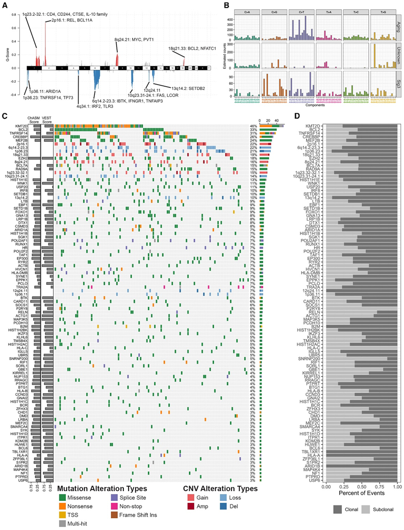 他们在整个基因组中发现了4个显著的拷贝数增加峰和7个显著的拷贝丢失峰(图5A)。这些区域包括REL、MYC和BCL2的增加,以及TNFAIP3、TNFRSF14和FAS的减少。此外,他们利用之前发表的BayesNMF模型得出了这些样本的突变特征情况,该模型揭示了这些样本中的3个突变特征(图5B)。Sig1是衰老的标志,在CpG基序上具有丰富的非聚集性C>T突变,并且与COSMIC标志1和患者年龄有很强的相关性。Sig3与许多DNA损伤反应特征一致,构成了大多数聚类状突变,其最丰富的取代类似于RCY基序中已知的激活诱导胞苷脱氨酶(AID) C>T/G突变(图5B)。