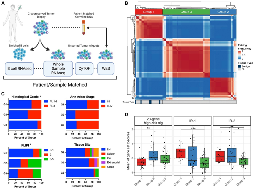 为了识别 FL 肿瘤中独特的 B 细胞转录状态,研究者团队对来自 FL 肿瘤和良性淋巴结的分离 B 细胞进行了转录组分析(RNA-seq)、全外显子测序(WES)(图1A)。他们实施非负矩阵分解(NMF)和共识聚类来定义患者之间稳定细胞状态的理想数量。根据迭代 NMF 运行的共识聚类选择标准将 3 个 FL B 细胞组 (G1–G3) 确定为最稳定(图1B)。为了确定聚类是否由肿瘤活检部位或临床特征(组织学分级、分期、FLIPI)驱动,他们寻找每个特征与单个聚类的关联,发现与组织学分级和FLIPI评分显著相关(图1C)。