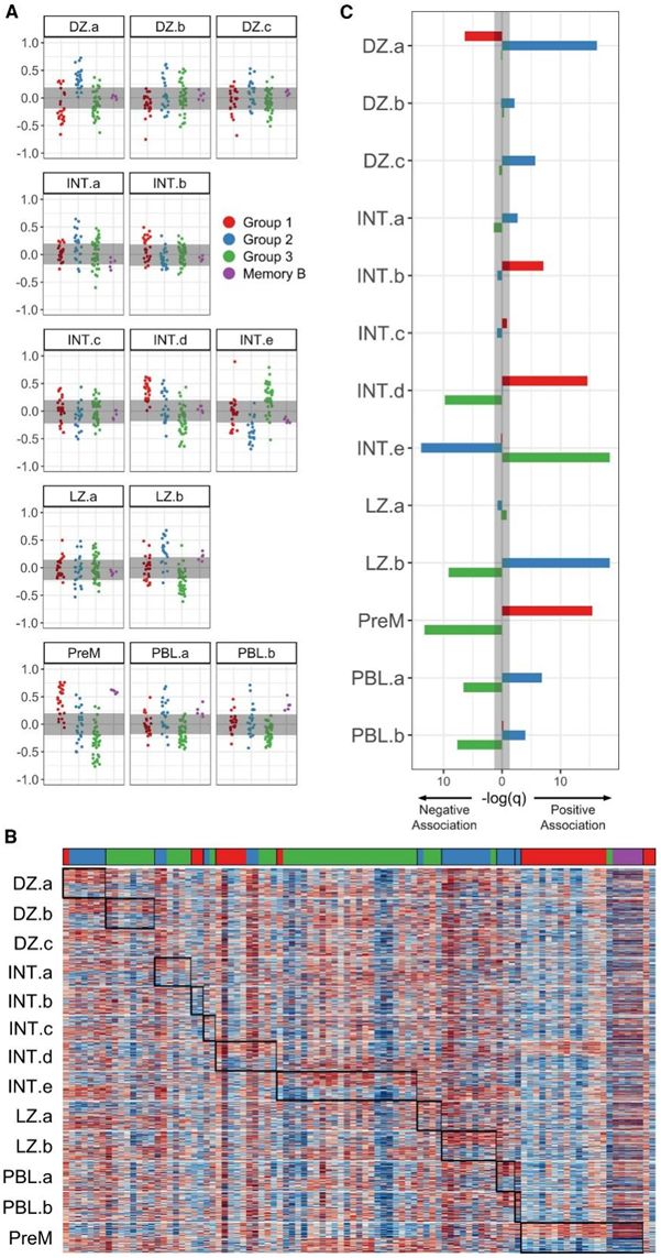 G1 和 G2 状态的最高正富集基因组包括中心细胞、中心母细胞、亮区和暗区。13种状态按照发育顺序排列,从暗区(DZ.a-DZ.c)、中间表型(INT.a-INT.e)、亮区(LZ. a和LZ.b)、到GC后的表型(前体记忆细胞[M]:preM;浆母细胞:PBL.a和PBL.b),每个样本在13种GC状态中至少有1种为显著阳性(图3A)。13个基因集分别独立检测,大多数样本(87.6%)在1个以上基因集上得分显著,通常来自相邻表型(即DZ.a和DZ.b)或相反表型(即DZ.c和preM)的阳性和阴性分数。基因表达模式也与每个样本中得分最高的基因集一致,突出了B细胞样本的异质性(图3B)。