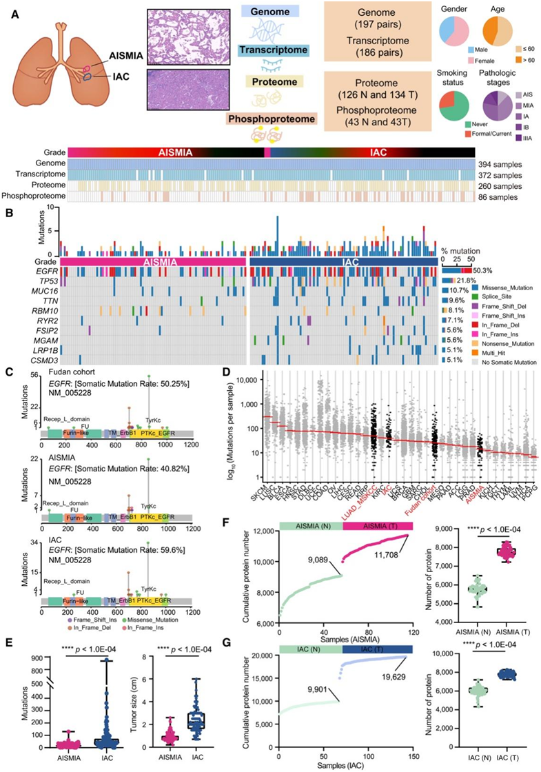 (A)AIS/MIA 和 IAC 队列的蛋白质组学概述。(B) 按肿瘤侵袭程度分层的前 10 个变异基因。(C) Lollipop图显示了复旦队列(所有肿瘤)以及 AIS/MIA 和 IAC 队列中EGFR突变的详细信息。(D) 复旦队列和其他公共队列中的肿瘤突变负担。(E) AIS/MIA 和 IAC 中的基因突变数量(左)和肿瘤大小(右)。(F)在 AIS/MIA 队列的正常组织和肿瘤中鉴定出累积蛋白质数量(左)和绝对蛋白质数量(右)。(G) 在 IAC 队列的正常组织和肿瘤中鉴定出累积蛋白质数量(左)和绝对蛋白质数量(右)。