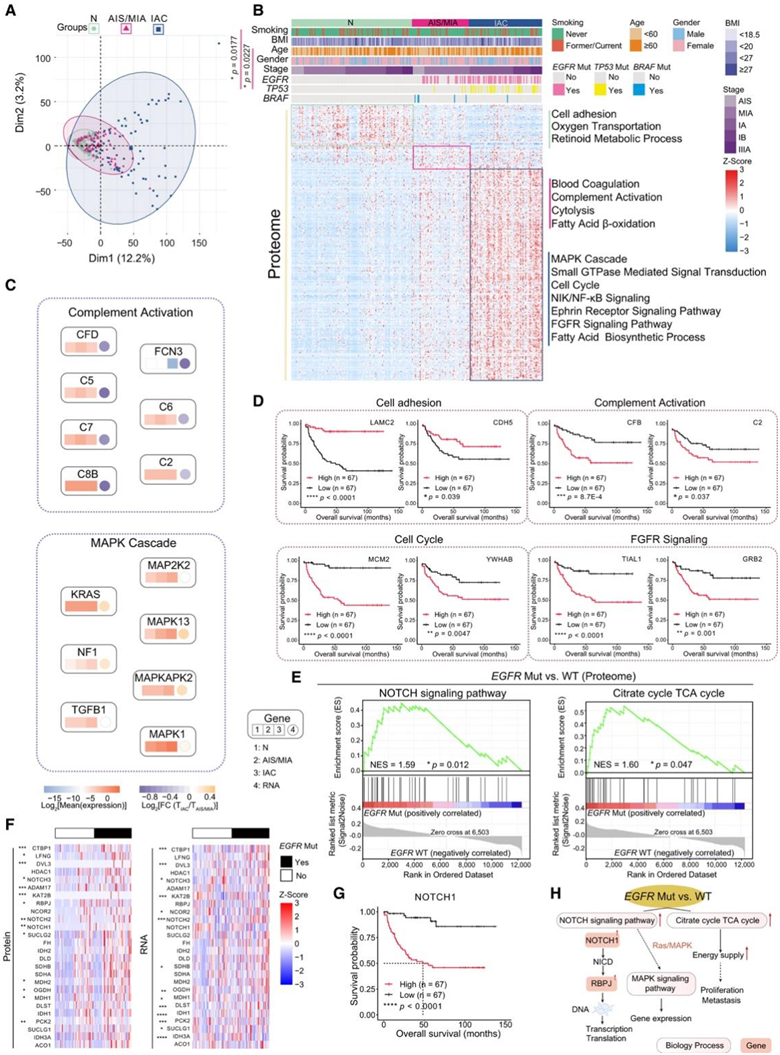 (A) 正常组织、AIS/MIA 和 IAC 中蛋白质组数据的主成分分析 (PCA)。 (B) 使用正常组织、AIS/MIA 和 IAC 中的蛋白质组数据绘制的富集通路热图。(C) 属于补体激活和 MAPK 级联的基因中的蛋白质水平和 RNA水平。(D)按细胞粘附、补体激活、细胞周期和 FGFR 信号转导相关基因的蛋白质水平分层的OS。(E) 基于按EGFR突变状态分层的蛋白质组数据的基因集富集分析 (GSEA)。(F) 按EGFR突变状态分层的与 NOTCH 信号通路和TCA 循环相关的基因的 RNA 和蛋白质表达水平。(G)按 NOTCH1(NOTCH 信号通路的关键分子)的蛋白质水平分层的 OS。(H) 显示EGFR突变和改变的通路之间相互作用的网络模型。