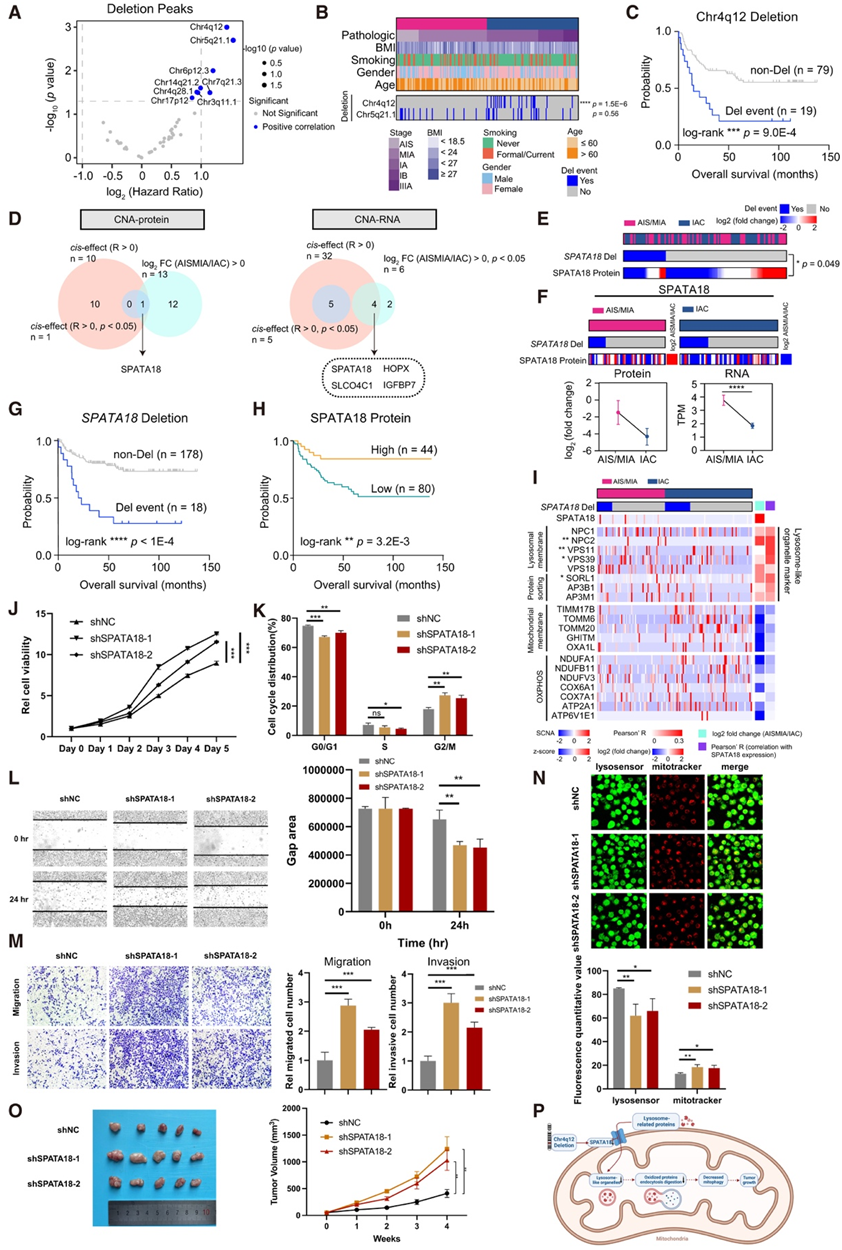 (A) 与肺腺癌患者的生存相关的缺失峰。(B) AIS/MIA 和 IAC中两个最显著缺失峰(chr5q21.1 和 chr4q12 缺失)的分布。(C) 按 chr4q12 缺失分层的总生存期 (OS)。(D) CNA-蛋白和 CNA-RNA 的相关性。(E) SPATA18缺失与蛋白质水平表达之间的关联。(F) AIS/MIA 和 IAC 中 SPATA18 蛋白和 RNA 表达的比较。(G) 按SPATA18缺失进行分层的 OS。(H)按 SPATA18 蛋白水平分层的 OS。(I) 热图可视化SPATA18缺失与溶酶体样细胞器和线粒体标记相关基因之间的相关性。(J) 在用 shSPATA18 或 shNC 转染的 A549 中通过 CCK-8 测定进行细胞增殖分析。(K) 在用 shSPATA18 或 shNC 转染的 A549 中进行细胞周期分析。(L) 下调 SPATA18 对伤口愈合的影响。(M) 下调 SPATA18 对迁移和侵袭的影响。(N) 转染过表达 SPATA18 或 shSPATA18 的 A549 中 LysoSensor 和 MitoTracker 的免疫荧光图像。(O) SPATA18对裸鼠A549细胞异种移植的影响。(P) 该图显示了 chr4q12 缺失、SPATA18 下调、线粒体自噬减少和肿瘤生长之间的关联。