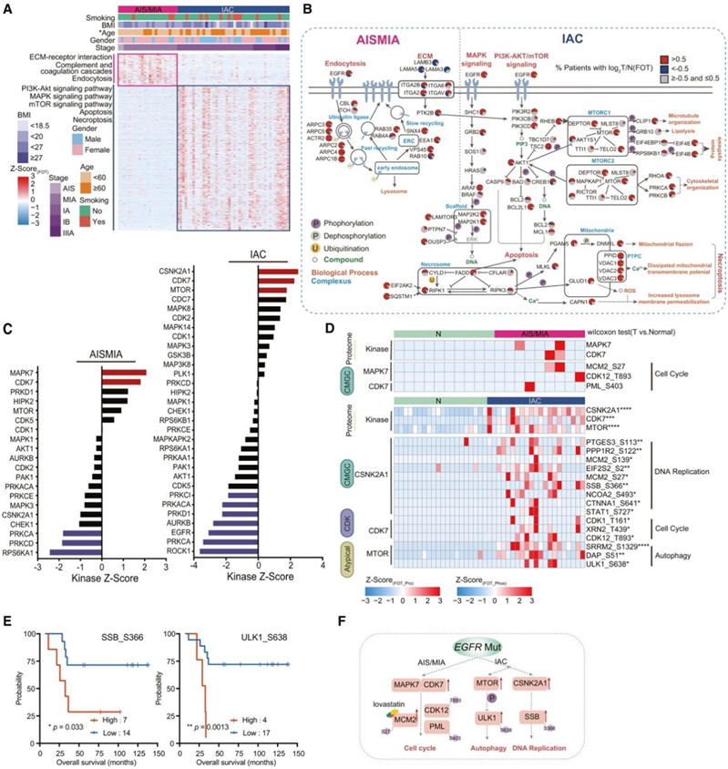 细胞外基质(ECM)受体相互作用、补体和凝血级联以及内吞作用在egfr突变型AIS/MIA中富集(图4A-B)。当疾病阶段进展到IAC时,典型的EGFR下游信号通路发生激活,如PI3K-Akt、MAPK和mTOR信号通路(图4A-B)。随后,他们比较了两组之间的激酶丰度。AIS/MIA具有较高的MAPK7表达,而IAC与CSNK2A1和MTOR过表达相关(图4C)。随着病情进展到IAC期,DNA复制和自噬发生激活(图4D),相关磷酸化蛋白(如SSB_S366和ULK1_S638)与肺癌患者的预后呈负相关(图4E)。