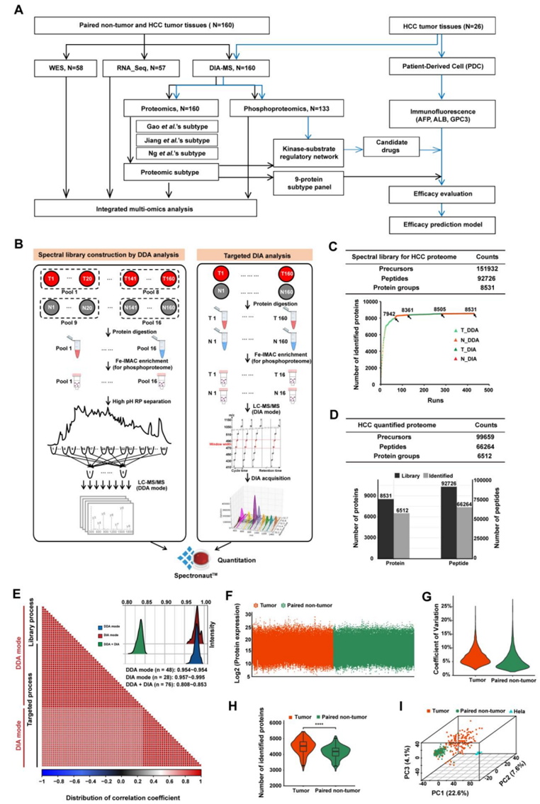 (A) HCC多组学研究概况。(B)蛋白质组学实验流程概述。(C) HCC组织谱库概述。(D) HCC组织DIA蛋白质组总结。(E)稳健和精确的蛋白质组学平台。(F)在HCC肿瘤和配对的32个非肿瘤组织中鉴定的蛋白丰度分布。(G) HCC肿瘤与配对非肿瘤样本的变异系数分布。(H) HCC肿瘤与配对的非肿瘤之间的蛋白数量有显著差异。(I)主成分分析(PCA)。