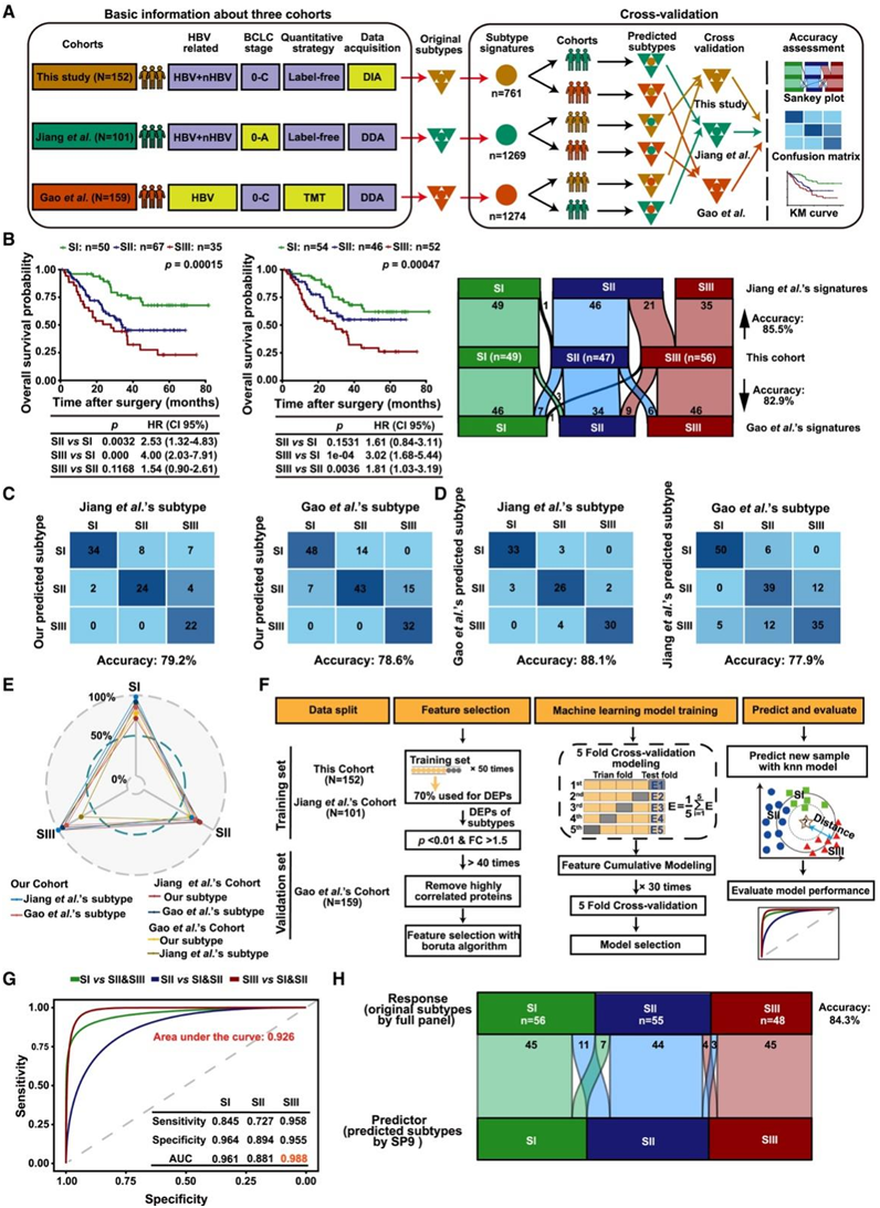 (A) 三个队列中蛋白质组特征交叉验证的工作流程。(B)左:显示了根据蛋白质组亚型的 OS 和 RFS 的 KM 曲线。右:冲积图显示了这些亚型与原始亚型之间的比较。(C-D)结合公开队列验证蛋白组特征。(E) 三个队列中三个蛋白质组特征的一致性率。(F) 开发用于区分蛋白质组亚型的简化面板的工作流程。(G) 用于区分验证集中蛋白质组亚型的简化面板的接收器操作特征准确性、灵敏度和特异性。(H) 冲积图显示了简化面板识别的蛋白质组亚型与验证集中的原始亚型之间的比较。