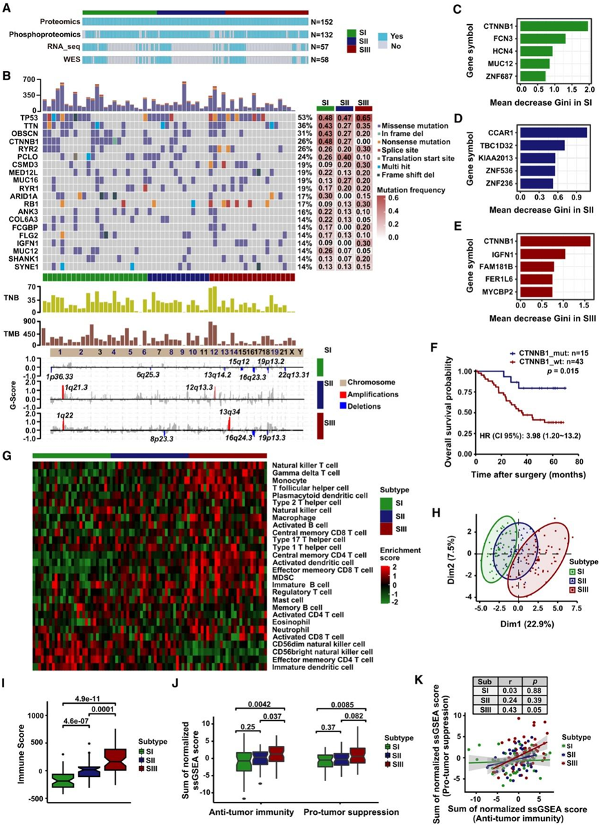 (A) 单个组学实验中使用的 152 个配对 HCC 病例的图示。(B) 基于 WES 的三种 HCC 蛋白质组亚型的基因组图谱。(C–E) SI、SII和 SIII的随机森林算法的特征重要性排名。(F) CTNNB1 突变或野生型 HCC 患者 OS 的 KM 曲线。(G) 热图显示属于不同蛋白质组亚型的 HCC 患者的免疫细胞群。(H) 基于三种蛋白质组亚型的蛋白质组数据的免疫细胞群免疫评分的主成分分析(PCA)图。(I) 三种蛋白质组亚型基于蛋白质组的免疫评分。(J) 三种蛋白质组亚型中基于蛋白质组的抗肿瘤免疫和促肿瘤免疫抑制的免疫评分。(K)基于三种蛋白质组亚型的蛋白质组的抗肿瘤免疫和促肿瘤免疫抑制之间的相关性。