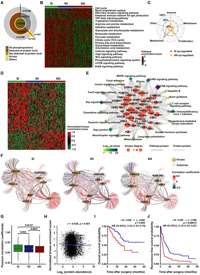 鉴于蛋白激酶已经发展成为癌症治疗的可行药物靶点,他们接下来研究了三种蛋白质组学亚型的激酶活性(通过底物的总体磷酸化水平反映)及其与底物磷酸化水平和激酶丰度的相关性。在HCC中共发现215个激酶,其中75个激酶的活性在3个亚型中存在差异,这些富集的通路也提示激酶活性与HCC的发生发展密切相关(图4D-E)。此外,激酶与底物的相关性在SIII中显著低于SI和SII(图4F-G)。然而,激酶丰度和激酶活性之间没有相关性(图4H)。此外,激酶活性和激酶丰度在HCC中的临床价值也有显著差异。例如,BCKDK、CDK16和MAP3K2的激酶活性,而不是激酶丰度,对HCC的预后有显著影响(图4I-J)。因此,有必要结合蛋白质组学和磷酸化蛋白质组学系统分析激酶的丰度和活性,以进行药物筛选和精准治疗。