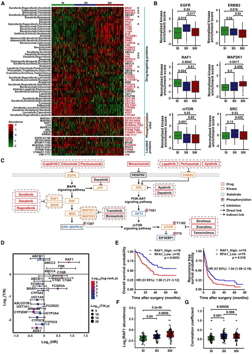 经过严格的筛选过程,临床可用药物的 22 个药物靶点中有 19 个显示出对 HCC 的显著预后价值(图 6D)。在这些靶点中,RAF1 与 OS 和 RFS 的负相关性最高(图 6 E)。SIII 中 RAF1 的丰度也显著高于 SI(图 6 F)。此外,与 SI 相比,RAF1 及其上游激酶之间的相关性在SII和SIII中显著增加,表明 RAF1 在 SII 和 SIII 中具有重要的调节作用(图 6 G)。这些观察结果可以表明 RAF1 靶向疗法(如索拉非尼、瑞戈非尼和达拉非尼)对 SIII 亚型 HCC 患者的潜在临床益处。