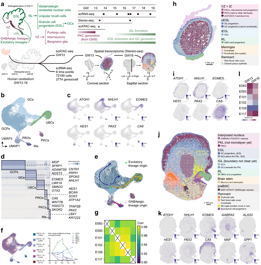 (a) 人类小脑中主要细胞类型发育的示意图(左上)以及胎儿样本的时间点和相应的生物事件(右上)。多组学分析的示意图(下)。(b) 整合的人类 scRNA-seq 数据的可视化以及细胞特征颜色编码。(c)整合的 scRNA-seq 中标记基因的基因表达模式。(d) 热图显示不同细胞类型的标记基因。(e) 基因速度流图在集成数据的 UMAP 嵌入上可视化。(f) scRNA-seq 数据中不同时间点的人类样本和主要细胞类型的贡献(左)。显示不同细胞类型比率变化的折线图(右)。(g)不同时间点的scRNA-seq数据之间的相关性。(h-k)不同细胞类型标记基因在 GW13和 GW16 的空间基因表达模式。(l) 不同时间点的空间转录组数据和scRNA-seq数据之间的相关性。