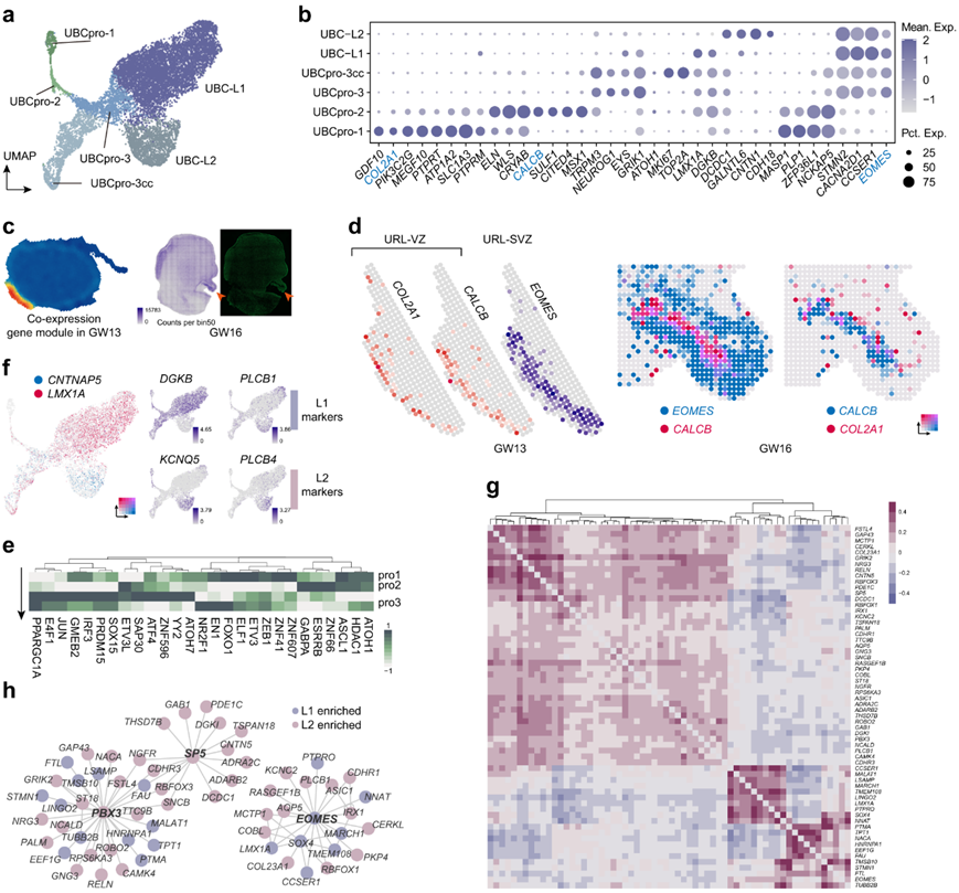 (a) UBC 谱系的可视化。(b) 点图显示(a)中不同细胞类型标记基因的表达模式。 (c) 热图显示 URL 中包含EOMES和CALCB的共表达基因模块的高强度(左)。人类 GW16 小脑的 RNA 计数图和荧光图像(右)。(d) 空间基因表达模式显示COL2A1 +细胞在 URL 中的分布。(e) 热图显示不同 UBC 祖细胞中的调节子强度。(f) CNTNAP5和LMX1A在不同 UBC 亚系中的基因表达模式(左)。已报道的 UBC 亚系标记的基因表达模式(右)。(g) 热图显示 UBC 亚系标记基因的相关系数。(h) GRN 显示不同 UBC 亚系的潜在调控程序。