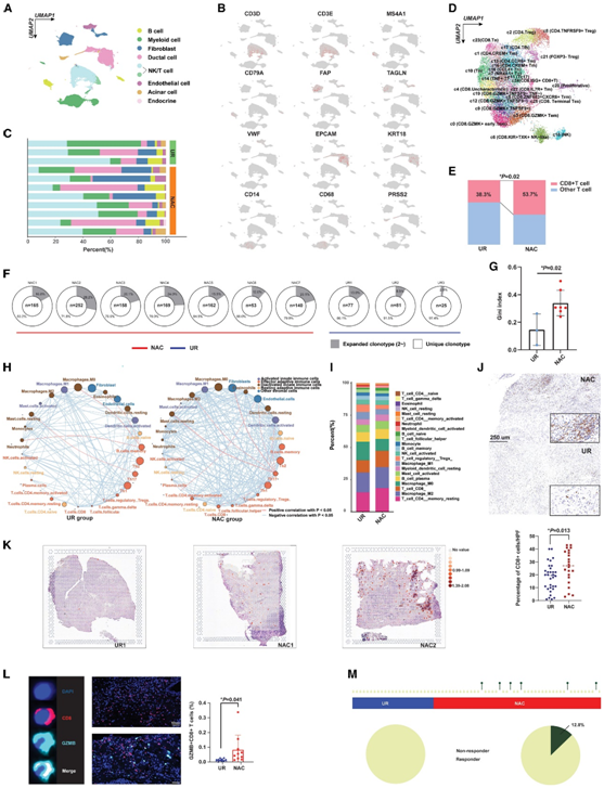 (A) UMAP 可视化。(B) 标记基因在不同细胞聚类之间的分布。(C)PDAC 样品中不同细胞聚类的百分比。(D) UMAP 图揭示了 NK 和 T 细胞的亚群。(E)通过卡方检验显示,经过 AG 处理的 PDAC 中富集了更多的 CD8 + T 细胞。(F)PDAC 显示出更高的 TCR 克隆型扩增。(G) NAC 的 PDAC 中 TCR 克隆型的基尼指数增加。(H) NAC 或 UR 组中免疫细胞的相关网络。(I)UR组和NAC组免疫细胞构成比较。(J) IHC 分析。(K) 空间转录组显示,含有 NAC 的 PDAC 样品的组织切片中富集了更多的 CD8 + T 细胞。(L) NAC处理的pdac中GZMB+ CD8+ T细胞的增加。(M)使用ImmuneCellAI算法进行分析,预测更多接受NAC的患者对免疫治疗有反应。