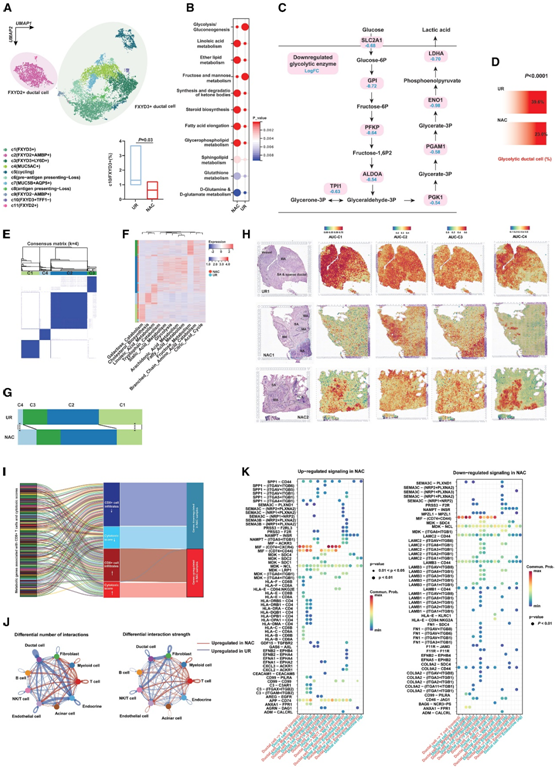 (A) UMAP 分析显示经过或未经 NAC 处理的 PDAC 中导管细胞的亚聚类。(B) 单细胞代谢分析显示 NAC 和 UR 组之间代谢通路的激活存在差异。(C) 单细胞水平的转录组分析揭示了胰腺导管细胞中糖酵解酶的差异表达。(D) 经过 NAC 处理的 PDAC 中糖酵解导管细胞的百分比较低。(E) 共识聚类根据代谢通路的单细胞水平活性区分了四种类型的导管细胞。(F) 热图显示不同导管亚型和治疗组中代谢通路活性的分布。(G) C4 导管细胞在 NAC 组中更加富集,而 C1 导管细胞在 UR 组中更加富集。(H) 空间转录组可视化了有/无 NAC 处理的 PDAC 中亚型相关特征的分布。(I)在处理的pdac中,大多数基因下调与高水平的细胞毒性特征和CD8+ T细胞浸润呈负相关。(J) CellChat 算法显示具有或不具有 NAC 的 PDAC 具有不同的通讯模式。(K) CellChat算法分析。