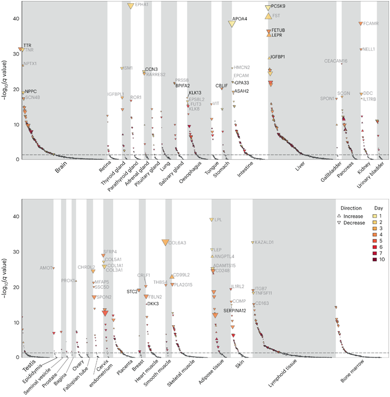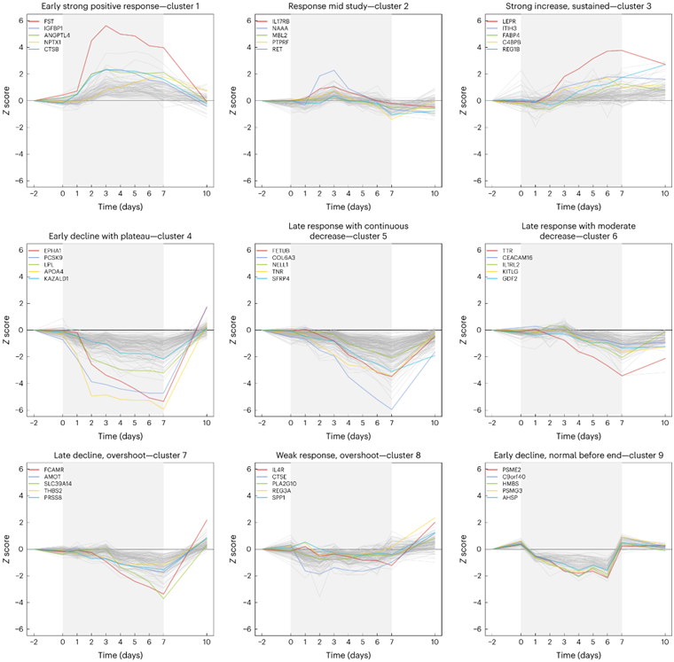 图3. 禁食期间血浆蛋白水平的时间轨迹。总共 1034 个蛋白质靶标在研究过程中表现出显著变化。