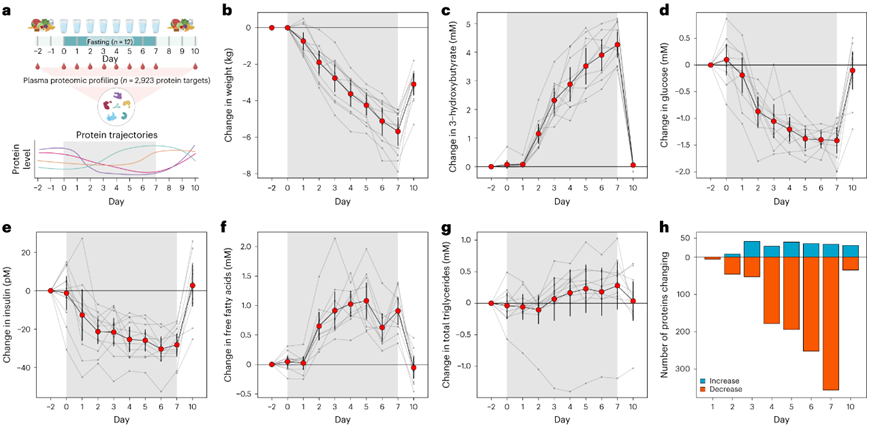 研究团队对12名参与者(5名女性和7名男性)进行了为期7天的禁食前、禁食期间和禁食后的研究,禁食期间和禁食后只有绝对的热量限制和随意饮水。他们在禁食干预前2天、干预期间每天以及停止干预后3天清晨(6:00 - 9:00)采集所有参与者的空腹血(图1a)。基于Olink 3072 Explore平台,他们在117个样本中共测量了2923个蛋白靶点。