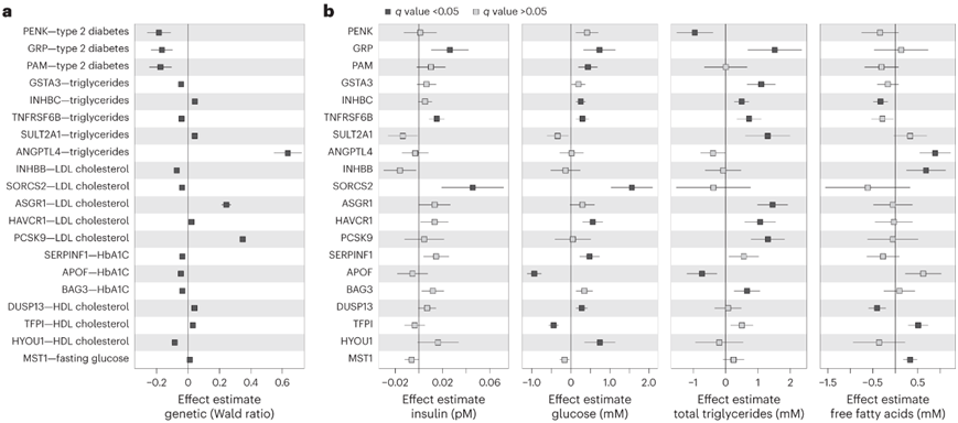 (a) 基因预测较高血浆蛋白水平对不同代谢特征的影响。(b) 效应估计来自混合效应线性回归模型,该模型将血浆蛋白水平与本研究中测量的不同血液生物标志物相关联。