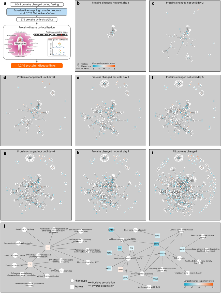 (a) 蛋白质编码基因附近蛋白质数量性状位点(pQTL)与疾病和健康措施的鉴定和连锁流程图。(b-i) 蛋白质-疾病网络分析禁食期间显著变化的蛋白质。 (j) 围绕两种不同因果遗传变异的样本网络,分别针对第XI因子和推测与骨表型因果相关的蛋白质展开。