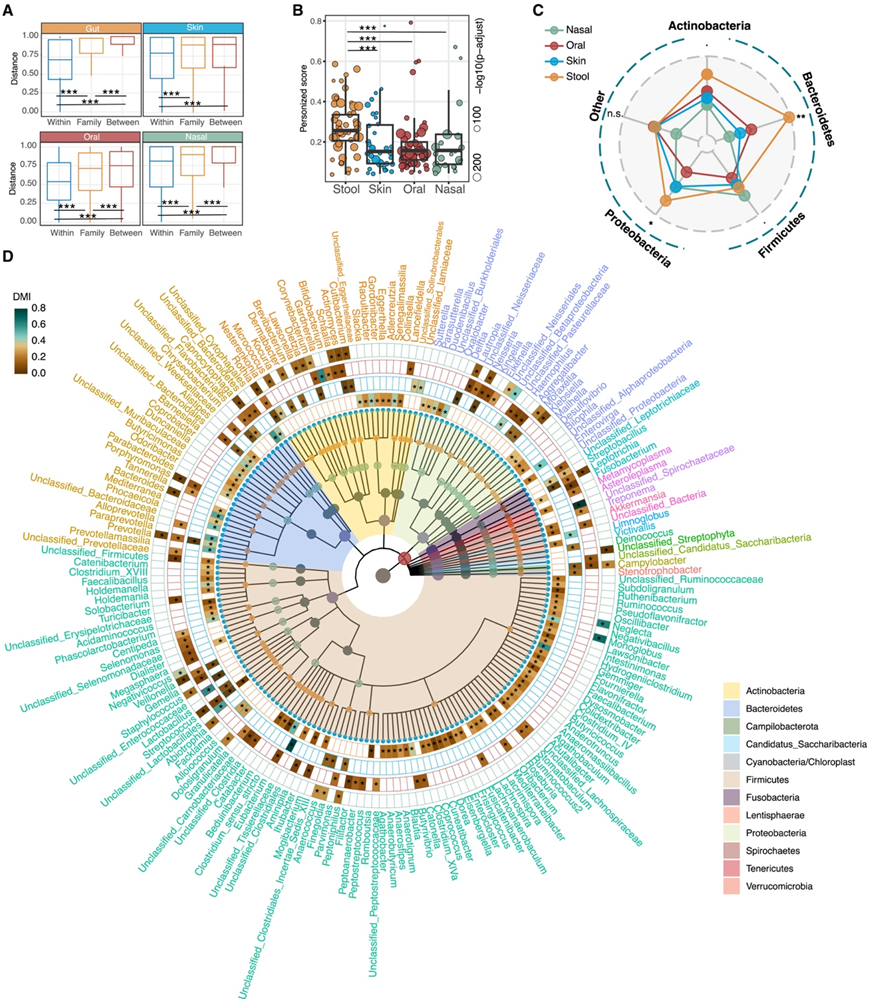 接下来,他们研究了不同部位微生物组在属水平上的稳定性,假设稳定性是分类群和部位特异性的,为每个属定义了一个度量“微生物个体度”(DMI),它量化了个体与种群的相似性;高DMI意味着微生物类群具有高度的个体特异性。他们还计算了“科评分”(FS),以评估科内的微生物差异。对粪便、皮肤、口腔和鼻腔微生物组的扩展观察也表明,与不同个体之间观察到的差异相比,个体内和科内的差异显著较小(图2A)。个体内,随着时间的推移,一个属内ASV的完全转化率在鼻腔微生物组中最高,其次是皮肤,粪便和口腔。尽管整体群落稳定,但这一发现强调了微生物组亚属水平上显著的个体内生态动态。