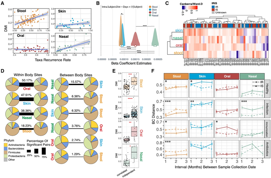 目前已知有三种强干扰事件(感染、接种疫苗和使用抗生素)可导致粪便微生物组破坏。在3个月期间,与IS人群相比,IR人群的粪便微生物组在健康就诊和干扰事件发生后出现了更大的时间变化(图3F)。然而,这种模式在其他身体部位并不一致,这表明对这些事件有特定部位的微生物组反应。