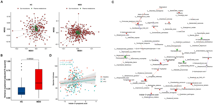 (A) Procrustes 分析的多维标度 (MDS)图显示 MDD 和 HC 队列中血浆代谢组和肠道微生物组之间的总体关联。(B) 与HC相比,MDD患者的肠道菌群解释的血浆代谢物差异明显更高。(C)血浆代谢物和微生物物种之间的关联网络。(D) 散点图显示了在三周时 Spearman 物种丰富度与吲哚 3-丙酸 (I3PA) 之间的相关性。