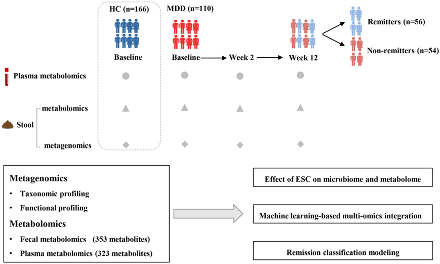 本研究纳入了来自大型队列的110 名 MDD 患者(41 名男性和 69 名女性)接受escitalopram(ESC,一种抗抑郁药) 单一疗法。同时,166 名健康个体(68 名男性和 98 名女性)匹配为健康对照(HC)(图1)。MDD组和HC组之间的年龄、性别和身体质量指数(BMI)没有显著差异。ESC治疗12周后,MDD患者汉密尔顿抑郁量表(HAMD-17)17项评分显著降低。其中,56例患者(50.91%)达到缓解(定义为HAMD-17≤7的缓解者),54例患者(49.09%)仍处于非缓解状态(定义为HAMD-17>7的非缓解者)。缓解(R)组和未缓解(NR)组除受教育程度和基线HAMD评分外,其他基线特征差异均无统计学意义,ESC 治疗后第 2 周和第 12 周,从 MDD 患者身上收集了总共 285 份粪便样本和 321 份血浆样本;从HC身上(在基线时)分别收集了 166 份粪便和血浆样本。所有样本均经过宏基因组测序和非靶向代谢组学分析。