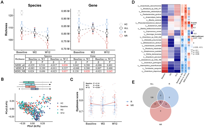 (A) ALL、R 和 NR 组从基线到第 12 周的物种和基因水平微生物丰富度的变化。(B) 基于不同群体的宏基因组图谱的主坐标分析(PCoA)图。(C) R 组和 NR 组的生态失调评分 (DS) 从基线到第 12 周的变化。(D) 热图显示了 24 个物种的平均丰度。(E) ESC 干预后 ALL、R和 NR 组中 metaCyc 通路显著下调的维恩图。