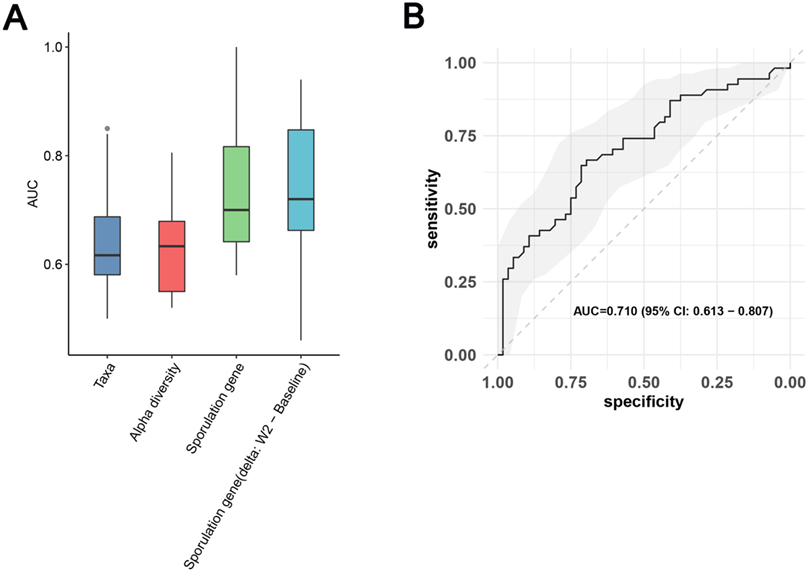 为了探索基线肠道微生物群对 MDD 患者治疗缓解的预测潜力,他们使用源自基线样本的三个不同特征集(分类群、多样性和孢子形成基因)构建了预测模型。使用受试者工作特征 (ROC) 的曲线下面积 (AUC) 评估模型性能。在建模结果中,微生物类群表现出较低的性能(平均 AUC = 0.61)(图 6 A)。然而,最高的平均预测性能是通过孢子形成基因模型(平均 AUC = 0.736)与十个外环模型(AUC = 0.710,通过合并所有外环测试结果绘制的 ROC)相结合实现的(图 6 B)。鉴于ESC对孢子形成基因的潜在影响,他们还根据孢子形成基因从基线到第2周的变化预测了MDD患者的临床缓解。结果表明,平均AUC和联合AUC分别为0.734和0.701,表明模型的预测性能中等至良好。