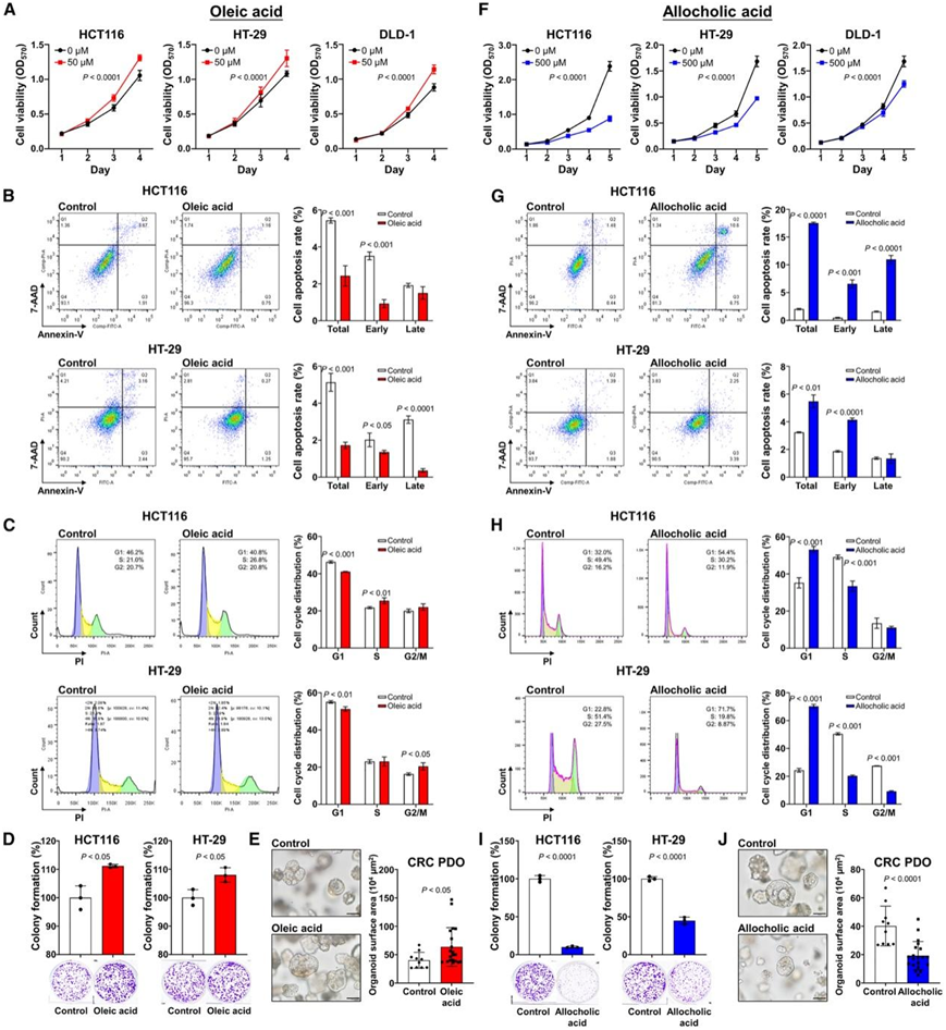 他们用在CRC 样本中富集的代谢物(包括油酸和二氢胸腺嘧啶)处理人 CRC 细胞系(HCT116、HT29 和 DLD-1)(图 2 C)。用油酸(50 μM)处理显著提高 CRC 细胞活力并减少 CRC 细胞凋亡(图 4 A-B)。油酸还导致合成(S)期 CRC 细胞显著增加,而 G1 期细胞显著减少(图 4 C)。此外,油酸处理后,CRC 细胞的增殖显著增强(图 4 D)。他们进一步用油酸处理 CRC 患者来源的类器官 (PDO),并观察到类器官生长增加(图4E)。别胆酸 (500 μM)处理显著降低了 CRC 细胞活力并促进CRC 细胞凋亡(图 4F-G)。它还诱导 CRC 细胞周期停滞并显著限制其增殖(图 4 H-I)。此外,别胆酸显著抑制了 CRC PDO 的生长(图 4 J)。