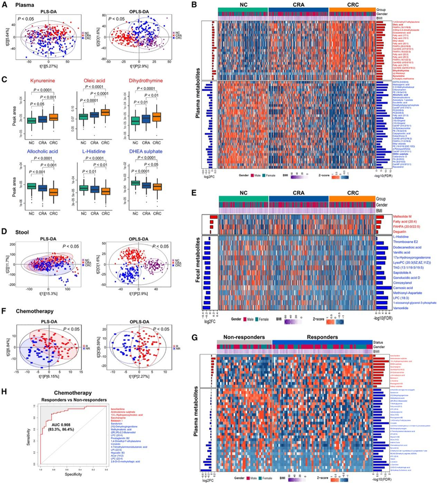 (A) CRC、CRA和 NC 的血浆代谢物分布。(B) 差异血浆代谢物热图。(C) 选定的差异血浆代谢物的特定峰。 (D) 粪便代谢物的分布。(E) 差异粪便代谢物的热图。(F)血浆代谢物分布。(G)差异血浆代谢物热图。(H) 19 种血浆代谢物生物标志物的受试者工作特征 (ROC) 分析,用于区分发现队列中化疗应答者和无应答者。