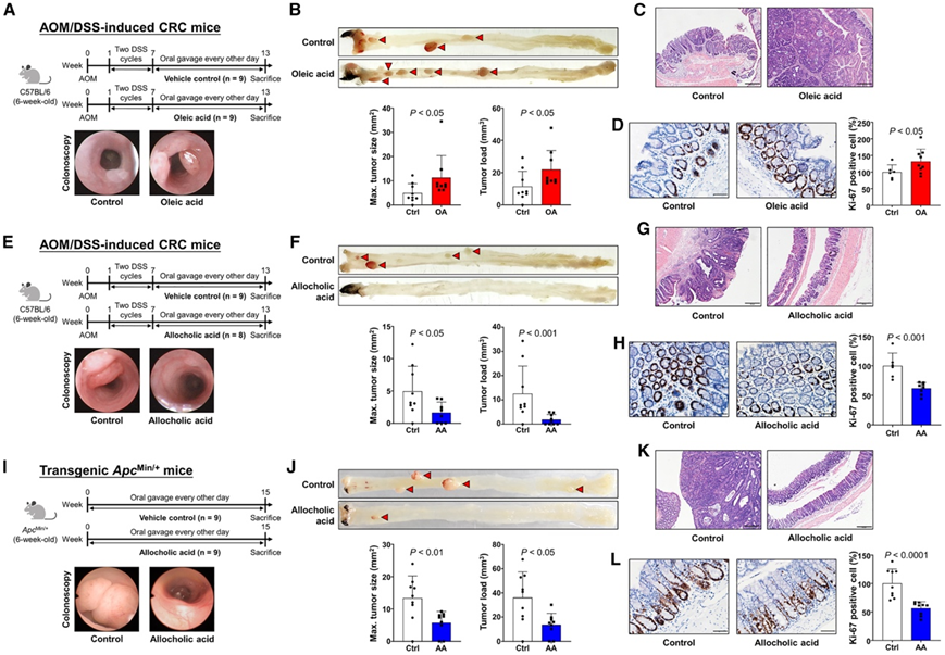 (A-D) 补充油酸的 AOM/DSS 处理小鼠的实验示意图和结肠镜检查图像、结肠形态和肿瘤参数、结肠 H&E 图像以及结肠 Ki-67 图像和评分。(E-H) 补充了别胆酸的 AOM/DSS 处理小鼠的实验示意图和结肠镜检查图像、结肠形态和肿瘤参数、结肠 H&E 图像以及结肠 Ki-67 图像和评分。(I-L) 补充异胆酸的Apc Min/+小鼠的实验示意图和结肠镜检查图像、结肠形态和肿瘤参数、结肠 H&E 图像以及结肠 Ki-67 图像和评分。