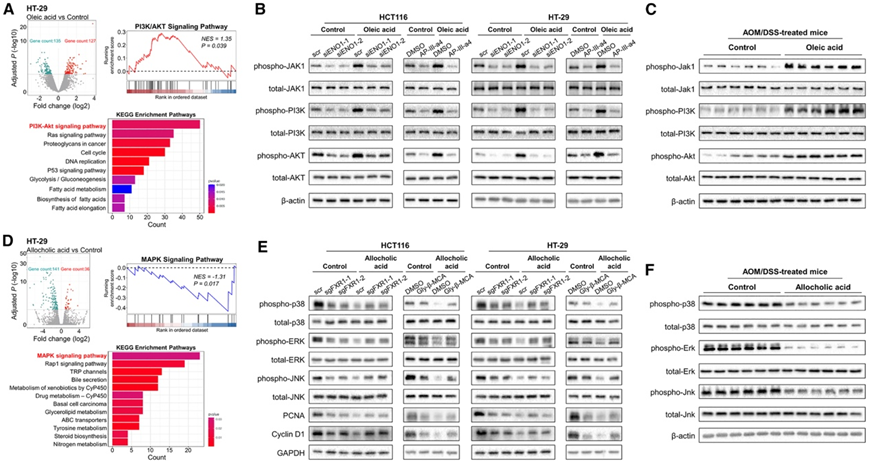 (A) 油酸处理后 CRC 细胞中差异基因和通路分析(KEGG 和 GSEA)的火山图。(B-C) CRC 细胞或 AOM/DSS 治疗小鼠的结肠肿瘤组织中 PI3K/Akt 通路标志物的蛋白质表达。(D) 异胆酸处理后CRC细胞中差异基因和通路分析的火山图。(E-F) CRC 细胞或 AOM/DSS 治疗小鼠结肠肿瘤组织中细胞增殖、细胞周期或 MAPK 通路标志物的蛋白质表达。