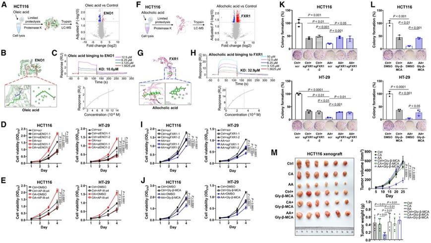 (A) LiP-MS实验示意图及油酸处理后CRC细胞中差异肽的火山图。 (B-C) 油酸和 ENO1 结合的分子对接分析和表面等离子体共振(SPR)分析。 (D-E)细胞活力分析。(F) CRC 细胞经异胆酸处理后差异肽的实验示意图和火山图。(G-H) 别胆酸和 FXR1 结合的分子对接分析和 SPR 分析。(I-J)细胞活力分析。(K-L)克隆形成分析。(M)肿瘤参数分析。
