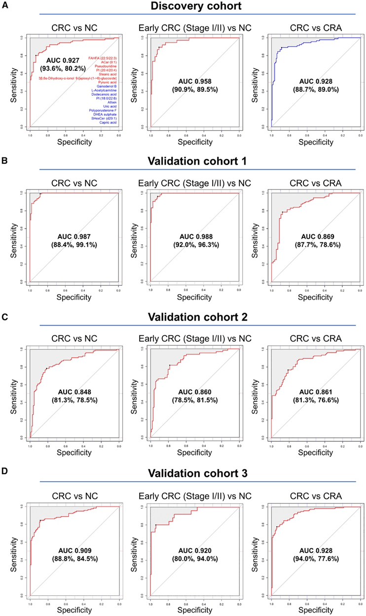 接下来,他们在排除临床信息不足的样本后,研究了代谢物作为发现队列中 CRC 和 CRA 诊断生物标志物的应用(图 1)。利用已鉴定的差异血浆代谢物,建立了多种机器学习模型(LASSO 和随机森林)和逻辑回归模型,用于将 CRC 与 NC 个体进行分类。在调整年龄、性别、体重指数 (BMI) 和肿瘤位置等临床参数后,一组包含 17 种血浆代谢物生物标志物在区分 CRC 与 NC 方面表现出色,LASSO 的 AUC 为 0.927(敏感性 = 80.2%,特异性 = 93.6%)(图 8 A)。他们评估了该模型在 CRC 不同阶段分类中的表现。该模型具有 0.958 的 AUC,可区分早期 CRC(I/II 期)和 NC(敏感性 = 89.5%,特异性 = 90.9%)(图 8 A)。它在区分 CRC 和 CRA 方面也表现出色,AUC 为 0.928(敏感性 = 89.0%,特异性 = 88.7%)。