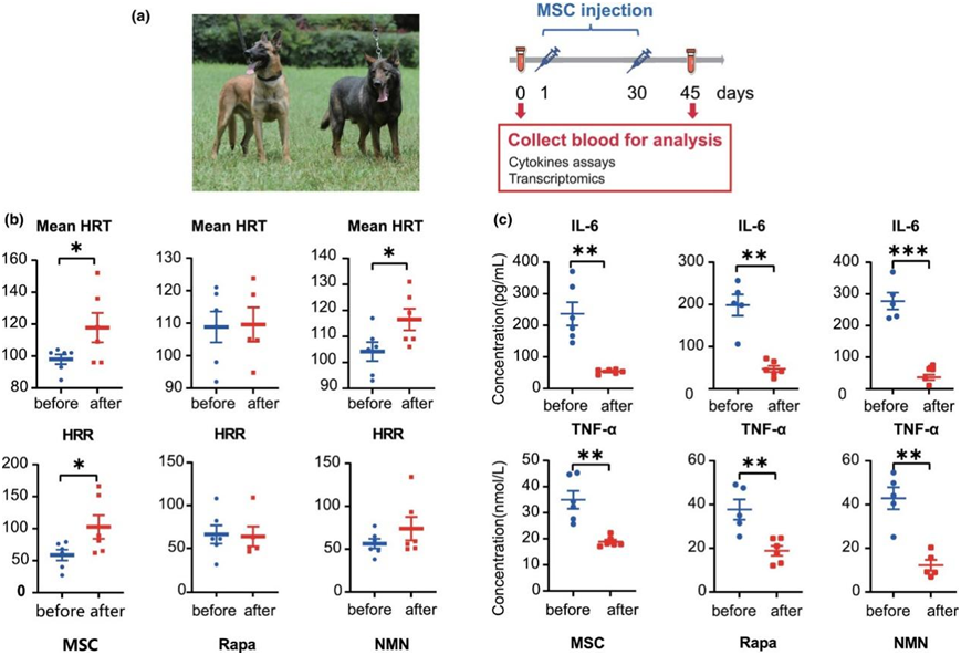 他们招募了 17 只退役警犬进行抗衰老研究,以评估狗对抗衰老干预措施的反应。比利时玛利诺犬是在比利时马林斯市附近饲养的军用工作犬,而昆明犬则是由中国本土犬与德国牧羊犬杂交培育而成(图 2a)。这些狗的平均年龄为 9 岁,相当于人类的 65 岁。他们将参与的狗分为三组,以进一步检测抗衰老干预措施的效果,这些措施包括使用同种异体犬间充质干细胞 (cMSC)、烟酰胺单核苷酸 (NMN)(NAD+ 的前体) 和雷帕霉素(Rapa)(图 2a)。