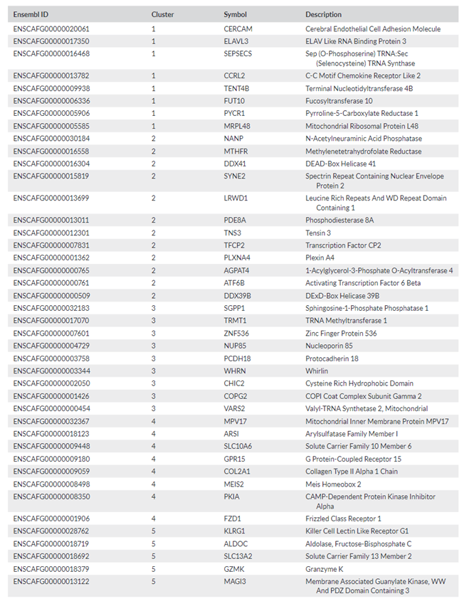 本项研究获得了30个RNA-seq文库,鉴定了61个动态变化的年龄相关基因,其中大部分与代谢和免疫功能相关,这些基因可能是狗衰老的主要生物标志物。接下来,他们用cMSC、烟酰胺单核苷酸和雷帕霉素治疗老年狗,结果表明,这些治疗可以显著降低炎症因子(IL-6和TNF-α)的水平。间充质干细胞有效改善老年犬的心脏功能。cMSC 治疗可逆转三个关键的潜在年龄相关基因(PYCR1、CCRL2和TOX),其中两个(CCRL2和TOX)与免疫有关。总的来说,本项分析了家养狗的转录组模式,并揭示它们可能是一个很好的衰老模型,特别是在抗炎研究中。