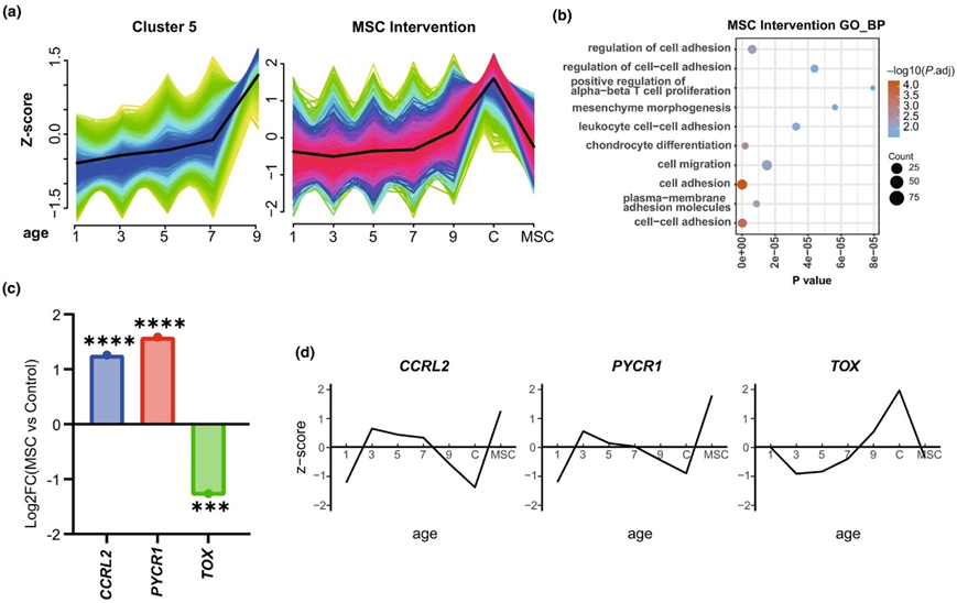 为了检测cMSC 治疗对基线模式的影响,他们结合了基线和 cMSC 治疗数据(图 S1b)。在聚类5中,这种模式在衰老阶段突然增加,并完全向相反方向调节(图4a)。聚类5 中的基因在细胞粘附和迁移、T细胞增殖、白细胞细胞间粘附和间充质形态发生等方面富集(图 4b),这可能表明间充质干细胞靶向细胞粘附和适应性免疫系统。