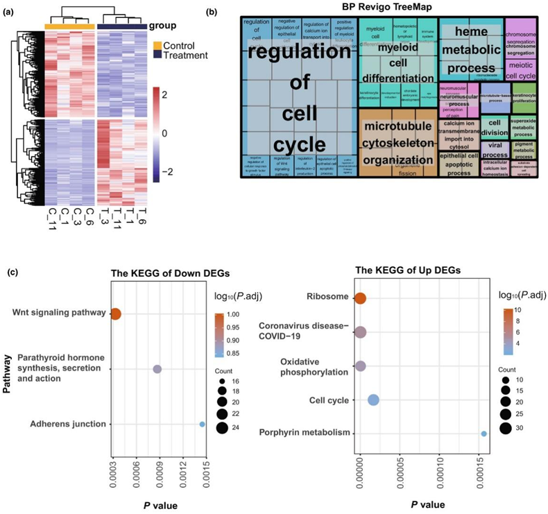 (a) 间充质干细胞治疗前后 DEG 的热图。 (b) GO富集结果的REVIGO树图。(c) 下调DEG和上调DEG的KEGG富集分析。
