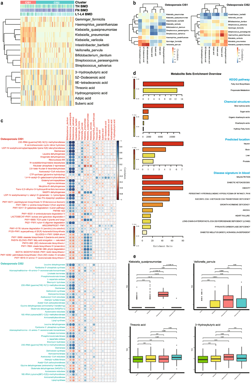这些特征在骨质疏松症及其亚型中的共同和特殊作用也得到了它们与骨质疏松症相关功能的关联的验证(图4c)。一般来说,微生物群特征比代谢物特征显示出更多的功能关联,表明微生物和宿主引起的常见和特定的代谢功能障碍。他们还发现这些特征在 CIS1 中比在 CIS2 中具有更多的功能关联。代谢特征分析揭示了额外的病原体信息(图4d)。通过富集分析,这些代谢物主要属于β羟基酸,参与脂肪酸生物合成和丙酸代谢。与正常组和骨质减少组相比,Klebsiella quasipneumoniae和小韦荣球菌在骨质疏松症CIS1中有特异性表达,3-羟基丁酸在骨质疏松症CIS1中有上调的趋势,而苏氨酸在骨质疏松症CIS2中有上调的趋势(图4e)。