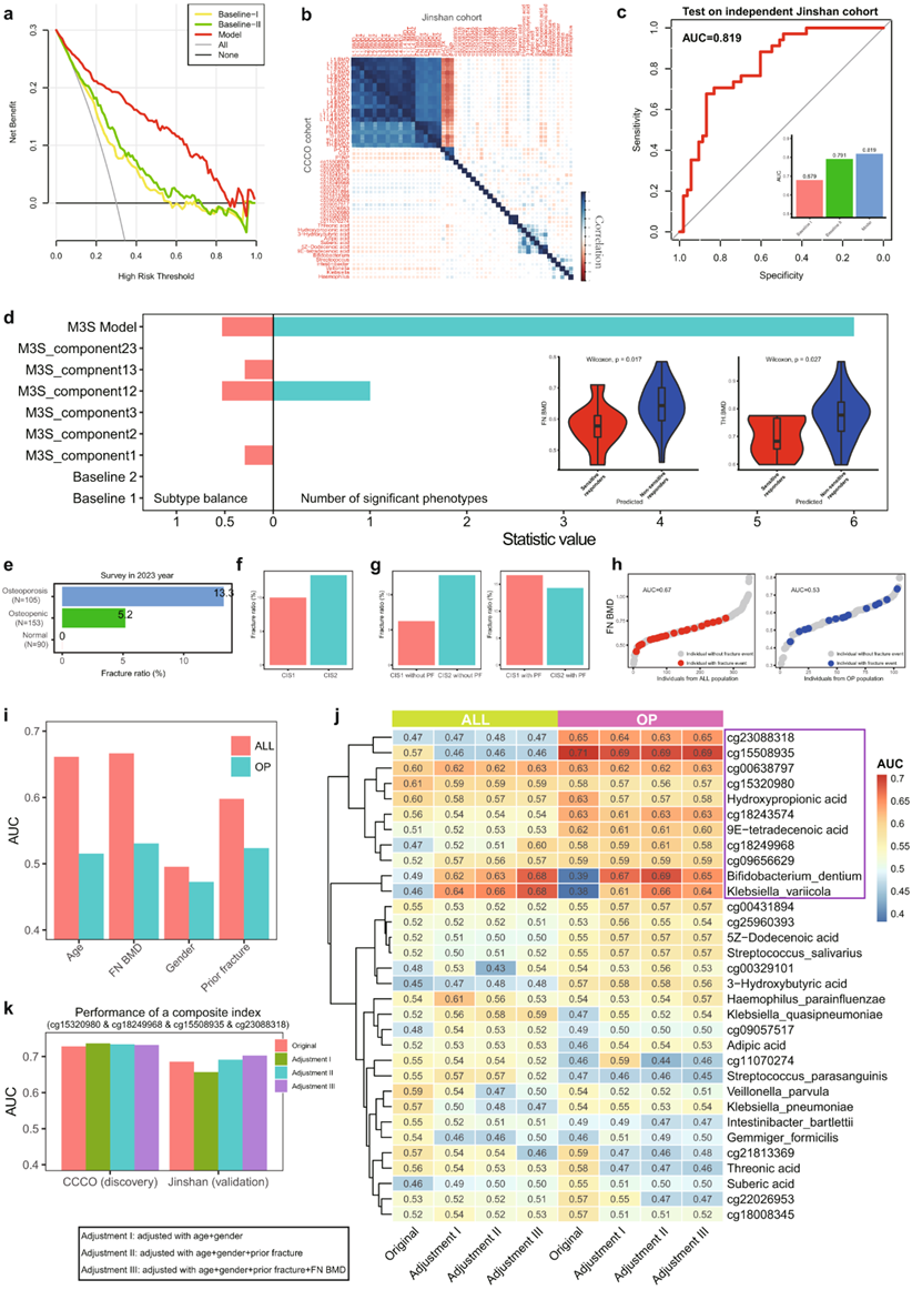 (a) 不同风险模型(骨质疏松症与其他)的决策曲线。 (b) CCCO 和金山队列之间表型关联的独立评估。 (c) 与两种基线方法相比,基于 M3S 的风险模型(骨质疏松症与其他)的独立性能评估。 (d) 与其他组件模型和基线方法相比,基于 M3S 的风险模型(阳 vs 阴子类型)的独立效应评估。 (e) CCCO 队列 4 年随访时骨折结果的统计数据。(f) 不同骨质疏松症亚型的骨折率。 (g) 通过既往骨折 (PF) 调整不同骨质疏松症亚型的骨折率。(h) 通过AUC排序分析进行骨折风险评估的病例。 (i) 骨折风险传统临床指标的 AUC。(j) 分别是 ALL 和 OP 群体中每个 M3S 特征的原始 AUC 和调整后的 AUC。(k) 分别根据发现队列(CCCO)和独立验证队列(金山)的原始和调整 AUC 预测骨折风险评估的综合指数。