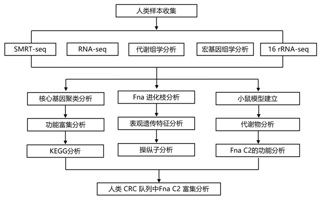 为了描述促进肿瘤定植的Fn遗传因素,本项研究生成了 135 个Fn菌株的基因组数据;来自非癌症个体的 80 种口腔菌株和从 51 名 CRC 患者的肿瘤中培养的 55 种独特癌症菌株。泛基因组分析确定了 483 个富含 CRC 的遗传因子。肿瘤分离菌株主要属于Fn亚种(Fna)。然而,基因组分析表明,Fna是单一亚种,但却由两个不同的进化枝(Fna C1 和Fna C2)组成。其中,只有Fna C2 在 CRC 肿瘤生态位中占主导地位,确定了 195 个Fna C2 相关遗传因素,这些因素与代谢潜力增加和胃肠道定植一致。Fna C2 处理的小鼠肠道腺瘤数量增加,代谢物发生改变。对 116 名 CRC 患者的人类肿瘤组织进行微生物组分析,结果显示Fna C2 富集。62 个配对样本的比较表明,与正常邻近组织相比,只有Fna C2 在肿瘤中富集。对 627 名 CRC 患者和 619 名健康个体粪便样本的宏基因组分析进一步支持了这一点。总的来说,本项研究结果确定了Fna进化枝分叉,表明Fna C2 特别驱动了人类 CRC 中的Fn富集,并揭示了Fna C2 对 CRC 生态位的病理适应的遗传基础。