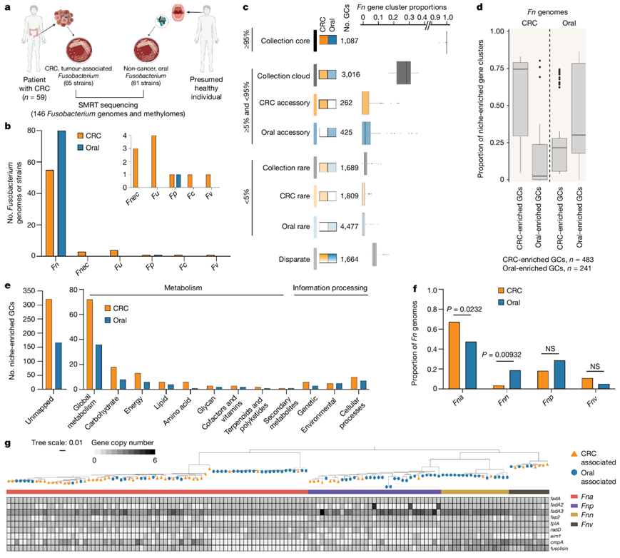 研究团队对 130 个人类 CRC 肿瘤进行了梭杆菌靶向培养,从 59 名独特患者中获得了 65 株与 CRC梭杆菌相关的菌株。鉴于Fn主要是一种口腔病原体,他们纳入了从非癌症个体口腔中分离出的81 株梭杆菌菌株,作为对照组。使用长读长单分子实时测序(SMRT-seq),他们为 146 种独特的梭杆菌菌株生成了完整且封闭的基因组,以及相应的表观遗传甲基化组(图1a),其中92%属于Fn(图1b)。由于Fn是CRC肿瘤中最常检测到的物种,因此他们将分析重点放在55个CRC相关和80个口腔相关的Fn基因组的比较上。