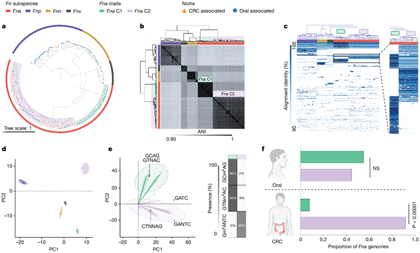 (a)最大似然全基因组系统发育树。 (b) ANI 矩阵的聚类树状图。(c) Fn基因组中蛋白质编码基因的 GiG-map 可视化。 (d)主成分分析(PCA)。 (e) 左:Fna全基因组甲基修饰核苷酸序列的 PCA。右:表格显示Fna进化枝中每个基序的分布。(f) 柱形图显示Fna CRC 相关基因组和Fna口腔相关基因组的比例。