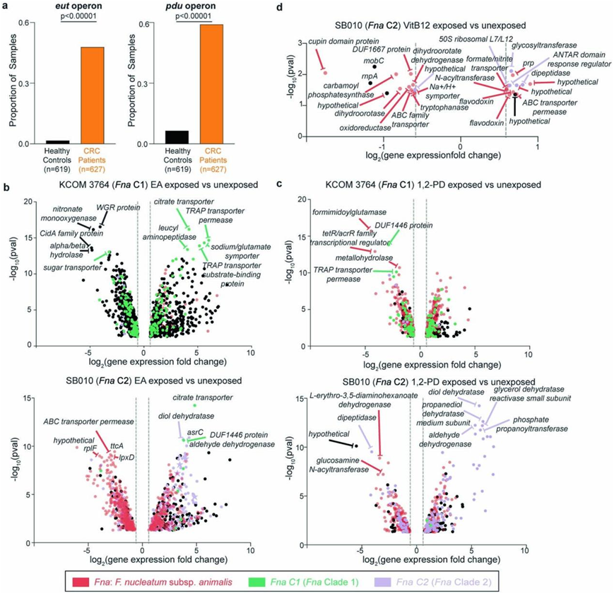 (a) 条形图显示了来自 CRC 患者或健康对照的粪便宏基因组样本中检测到假定的eut和pdu操纵子的比例。 (b-d)上调和下调的基因分析。