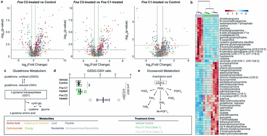 他们对每个处理组的肠道组织进行了代谢组学分析。肠道代谢物的偏最小二乘判别分析表明,Fna C2 处理的小鼠形成了一个与其他处理组不同的聚类,表明代谢特征存在差异。然而,Fna C1 处理小鼠和载体对照小鼠的肠道代谢物具有更相似的代谢谱,聚集在一起(图4c)。对比分析显示,与Fna c1处理和对照小鼠相比,Fna c2处理小鼠的谷胱甘肽代谢和γ-谷氨酰氨基酸途径显著富集(图S7a-c)。具体来说,他们观察到γ-谷氨酰半胱氨酸(GSH)合成的前体水平显著增加,包括半胱氨酸和γ-谷氨酰半胱氨酸,还原型谷胱甘肽(GSH)水平下降,GSH降解产物5-氧脯氨酸水平显著升高(图S8a-c)。GSH 缺乏或氧化型 (GSSG) 与还原型 (GSH) 谷胱甘肽的比例升高会增加哺乳动物细胞对氧化应激、炎症和肿瘤进展的脆弱性。与对照组和Fna C1 处理组相比, Fna C2 处理组小鼠的 GSSG/GSH 比率显著增加,表明氧化应激增加(图S8d)。γ-谷氨酰转肽酶代谢GSH可以发挥促氧化作用。