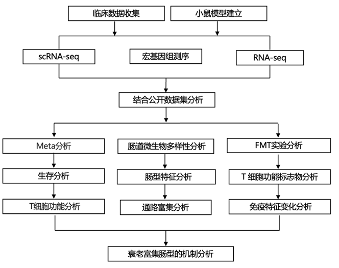 本项研究通过一项包含 25 项中小型免疫检查点阻断 (ICB) 试验的meta分析,证明老年人对 ICB 疗法表现出更高的反应性,还分析了多项研究的scRNA-seq数据,并揭示了老年患者TME中耗竭和细胞毒性 T 细胞标记物的明显上调。本项研究确定了一种与改善老年患者免疫治疗结果相关的衰老肠道型。小鼠粪便微生物群移植实验证实了富含衰老肠型的治疗潜力,可增强治疗敏感性并重塑 TME。