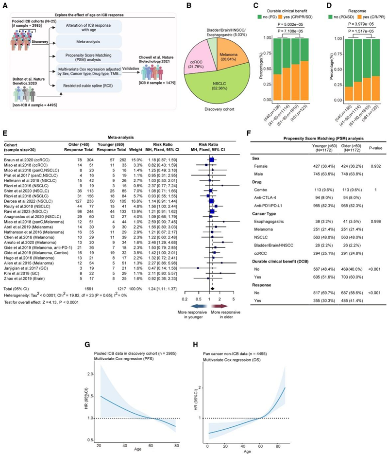 (A) 临床数据分析的工作流程。(B) 饼图显示发现队列中癌症类型的比例。(C-D) 堆积图显示发现队列中每个年龄范围具有持久临床获益或缓解的患者比例。(E) 森林图显示老年 (>60岁) 和年轻 (≤60岁) 癌症患者之间 ICB 反应率差异的meta分析结果。(F) 通过在发现队列中进行倾向评分匹配分析,比较老年组和年轻组之间的临床差异的RCS。(G-H)对接受ICB治疗的癌症患者的无进展生存期(PFS)和未接受ICB治疗的癌症患者的总生存期(OS)进行多变量Cox比例风险回归分析。