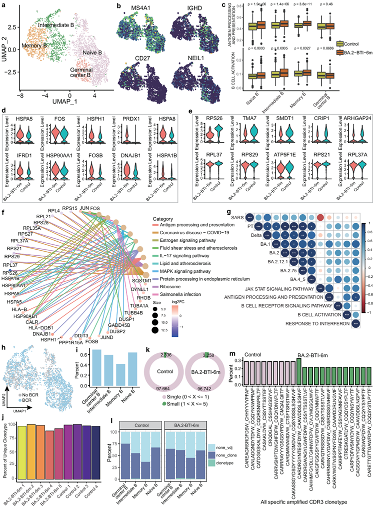(a) 显示 B 细胞亚群和聚类的 UMAP 图表。 (b) UMAP 图显示 B 细胞亚群中标记基因的表达。(c) 箱线图显示对照组和 BA.2-BTI-6m 组之间抗原加工和呈递以及 B 细胞亚群的 B 细胞活化评分的差异。 (d-e) 小提琴图显示了幼稚 B 细胞中前 10 个上调和下调的差异基因。(f)差异基因的功能富集分析。 (g) 不同病毒株的抗原呈递、干扰素和B细胞激活模块评分和中和活性之间的相关性。(h) UMAP 图显示带有 BCR 信息的 B 细胞。(i) 条形图显示 B 细胞亚群中检测到的 BCR 比例。(j) 条形图指示单个样本的 BCR 克隆比例。(k) 圆形图显示了对照组和BA.2-BTI-6m组中不同频率的BCR的比例。(l) 堆积条形图显示 B 细胞亚群中克隆亚型的比例。 (m) 条形图显示对照组和 BA.2-BTI-6m 组中扩增最多的特定 BCR CDR3 序列。