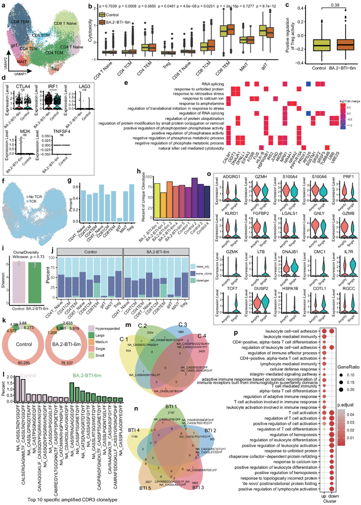 (a) 显示 T 细胞亚群和聚类的 UMAP图表。 (b) 箱线图显示两组之间 T 细胞毒性评分的差异。(c) 箱线图显示两组之间 Treg 激活基因集评分的差异。(d) 小提琴图显示对照组和BA.2-BTI-6m组中Treg活性抑制基因的表达水平。(e) 热图显示了Treg差异基因富集的生物学过程。(f) UMAP 图显示带有 TCR 信息的 T 细胞。(g) 条形图显示 T 细胞亚群中检测到的 TCR 比例。(h) 显示单个样本的 TCR 克隆比例的条形图。 (i) 条形图显示两组之间 TCR 多样性的差异。(j) 显示克隆 T 细胞亚群比例的堆积条形图。(k) 圆形图显示对照组和BA.2-BTI-6m组中不同频率TCR的比例。(l) 条形图显示在对照或 BA.2-BTI-6m 组中专门扩增的前 10 个 TCR CDR3 序列。(m) 维恩图显示对照组样本中 TCR 的交集。(n) 维恩图显示BA.2-BTI-6m 组样品的 TCR 交集。(o) 小提琴图显示 CD8 TEM 中前 10 个上调和下调的差异基因。(p) 通过 CD8 TEM 对上调和下调的 DEG 进行功能富集分析。